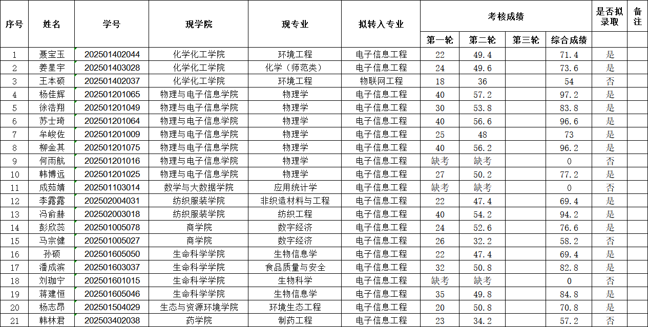 附件:2025-2026-1学期物理与电子信息学院转专业考核结果及拟录取名单
