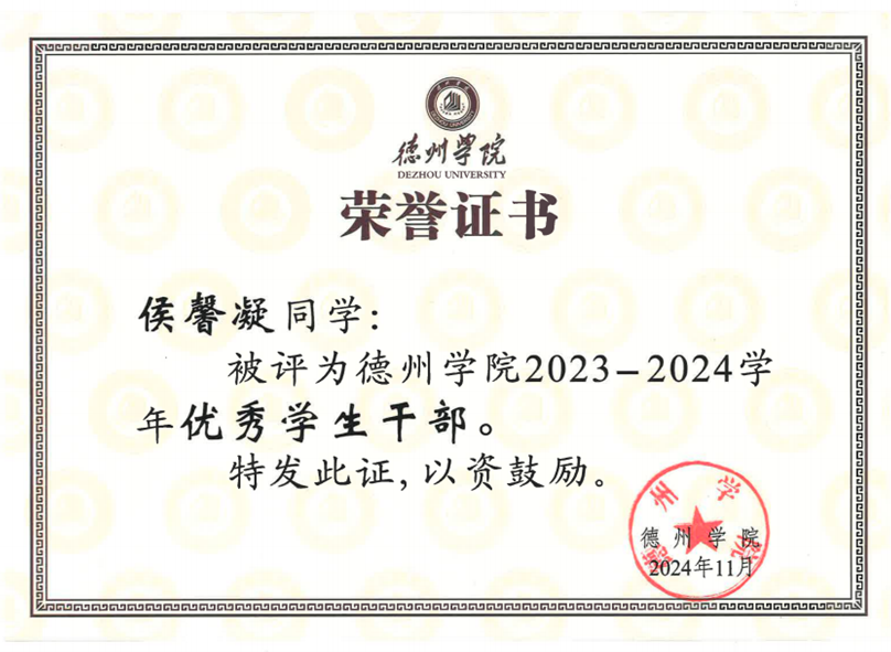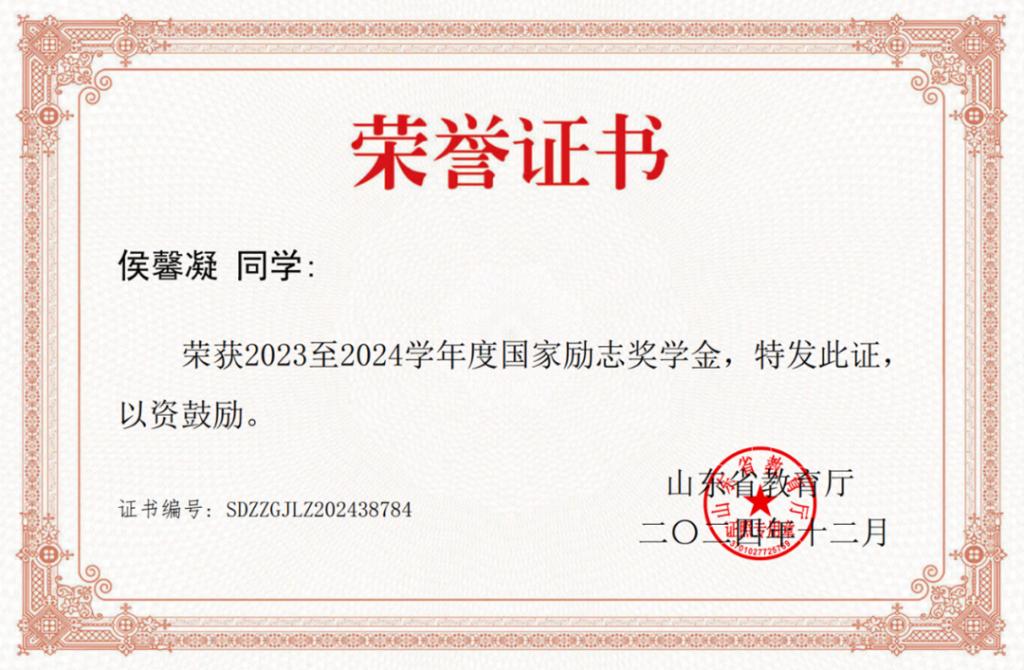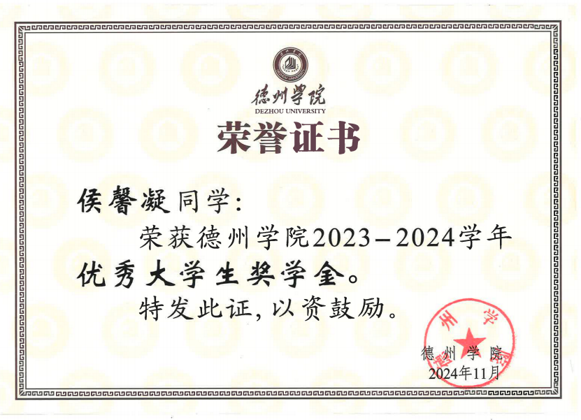 大一学年,侯馨凝学习成绩与综合成绩均位列专业第一,综合成绩91.86分。单学期最高学分绩点达4.27。荣获 2023-2024学年国家励志奖学金与德州学院优秀大学生奖学金。大二学年开始辅修法学双学位,法学成绩位于双学位班前两名。先后考取了C1驾驶证、普通话二甲、初级会计、英语四级、计算机二级、英语六级,努力向复合型人才迈进。入学以来所有科目绩点3.83,绩点排名居专业第一,斩获2024德州学院“十佳学习标兵”、2024-2025 学年国家奖学金。