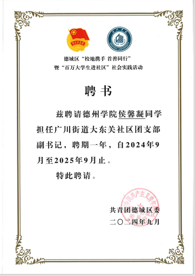 她曾在“一站式”学生社区与事务发展中心担任活动部干事,参与各类活动的组织策划;同时热爱志愿服务,多次参与学院青志部活动,并动员团支部团员投身志愿工作;担任过德城区广川街道大东关社区兼职团干部,搭建学校与社区的沟通桥梁。参与2025大学生返家乡社会实践,服务于平度市环境生态局。2025年 4月,在学院统一安排的综合工程实训中表现出色,获评优秀学员。侯馨凝积极参与运动会、越野赛、辩论赛、演讲比赛等各类文体活动,多次荣登手机版BBIN下载官方公众号、传递榜样力量、书写多维青春。